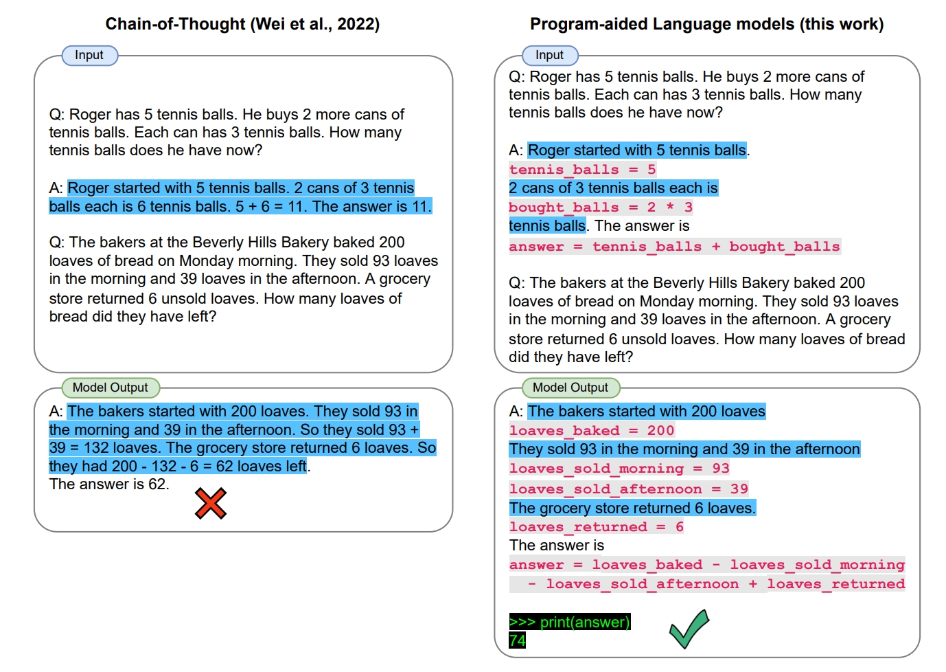A: The bakers baked 200 loaves of bread. They sold 93 + 39 = 132 loaves. After the grocery store returned 6 unsold loaves, the bakery had 200 - 132 + 6 = 74 loaves of bread left. The answer is 74.当年 Luyu Gao 的解决方法是在 prompt 里引入代码,并引导模型使用代码来运算和思考,最后答案就是正确的: