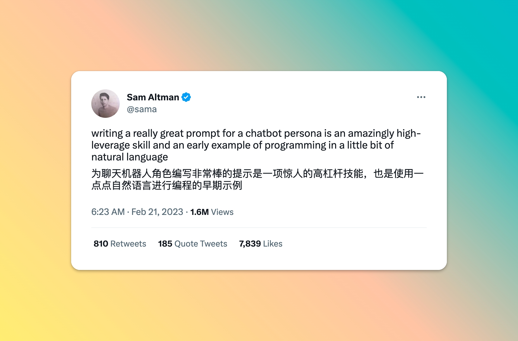 OpenAI 的 CEO Sam Altman 在今年 2 月底提到给 ChatBot 写 prompt 是个非常高杠杆的技能。