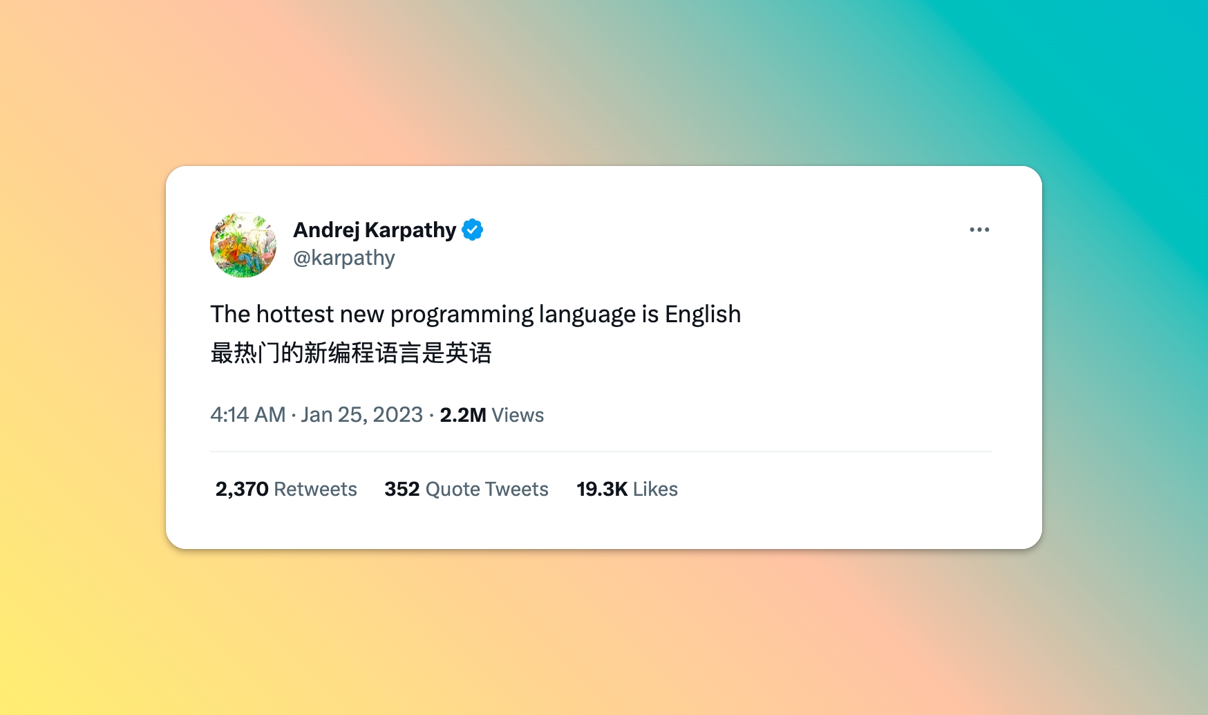 前特斯拉 AI 负责人 Andrej Karpathy(对了,他之前就在 OpenAI,最近二进宫回OpenAI 了) 今年 1 月底,说了这样的一句话:
