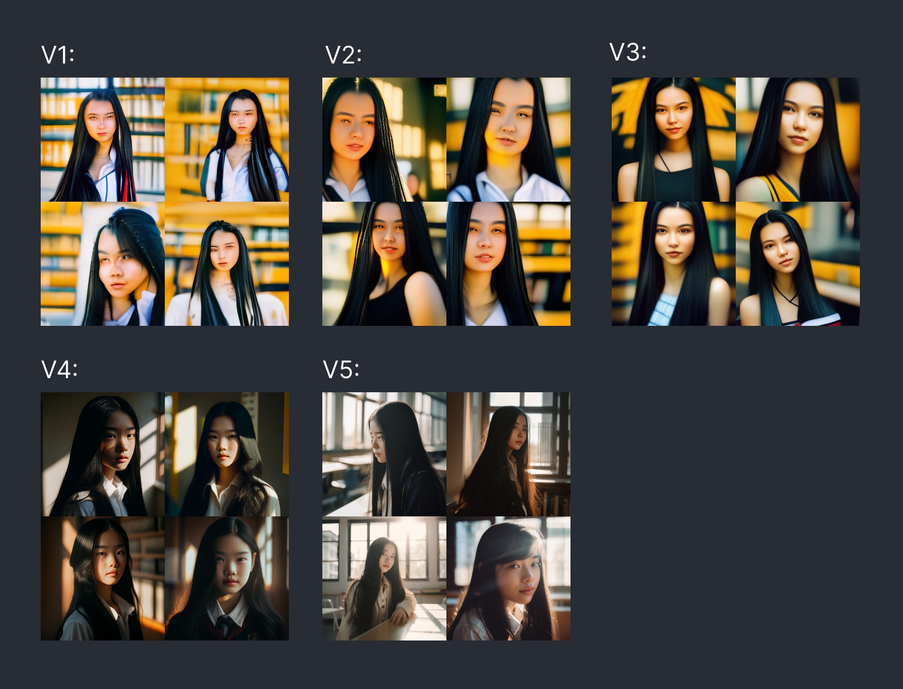 21years chinese girl, in school, beauty, long black hair, sun light,insane detail, smooth light, real photography fujifilm superia, full HD, taken on a Canon EOS R5 F1.2 ISO100 35MM看看生成的结果,是不是差距非常大,从 V1 到 V5 的进化,Midjourney 大约花了 1 年的时间,如果仅算研发时间,我觉得应该不到 1 年,非常了不起: