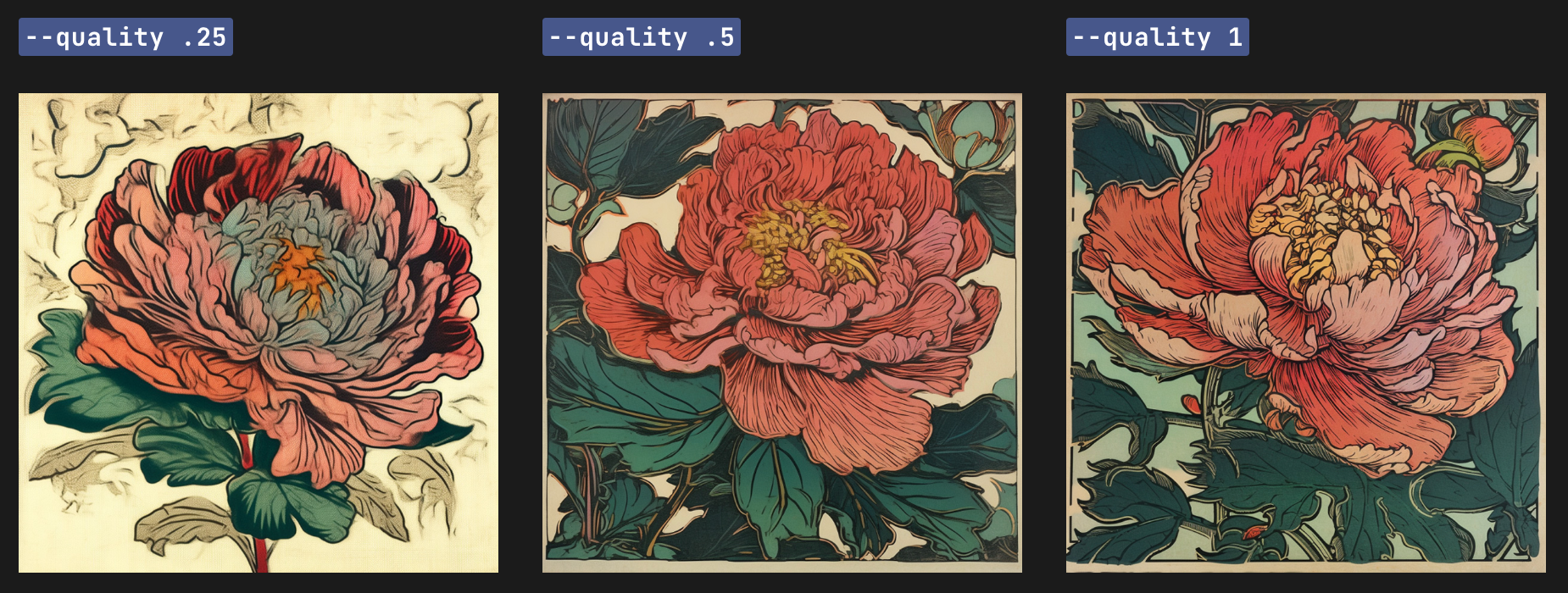 但低 Quality 也不是没有好处,它的好处是生成图片的时间会更快,换句话说,你可以花更少的 GPU 时间,我一般会用这个参数做一些探索性生成图,大方向没问题,再让模型丰富细节。