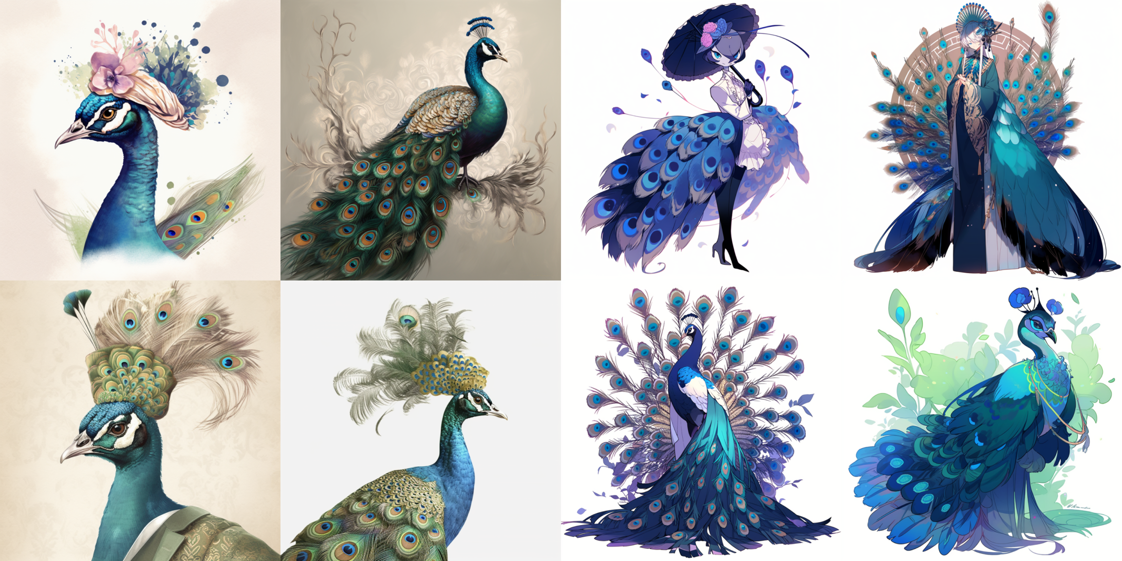 它在生成动漫类的图片上,比较在行。举个例子,prompt 是 fancy peacock,左图是 v5 模型,右图是 niji v5模型,右图更偏向于漫画风格: