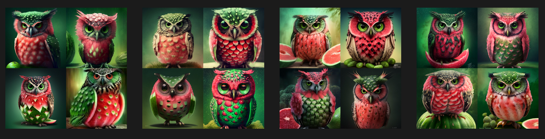 这是当 Chaos 为 0 的时候,一致性会比较高,西瓜和猫头鹰的融合的方式,在四次输出里都比较类似,另外在单次输出里,4张图(四宫格)的风格相似度也比较高: