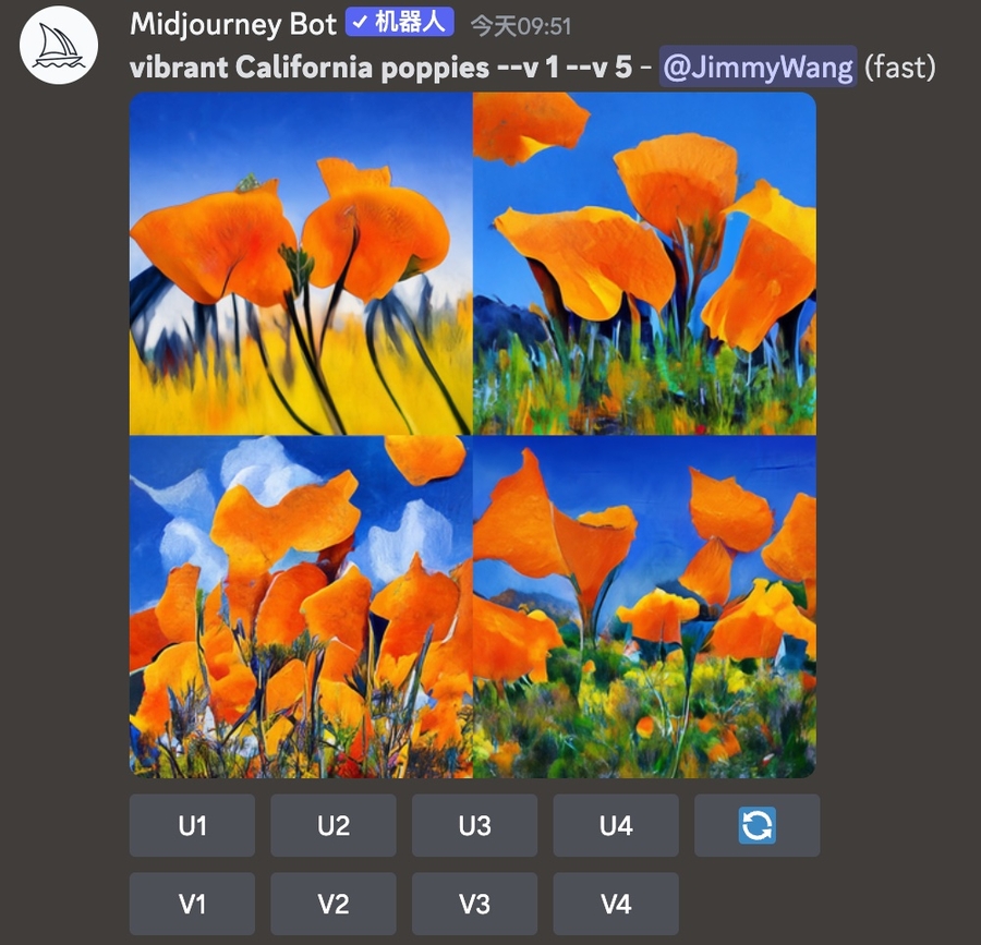 目前 Midjourney 支持多个版本,最新的版本是 V5 ,跟 ChatGPT 稍微有点不一样,Midjourney 给我的感觉,并不是版本越大,越厉害,而是擅长的东西不太一样。相关区别请查阅 Midjourney 各版本差异。