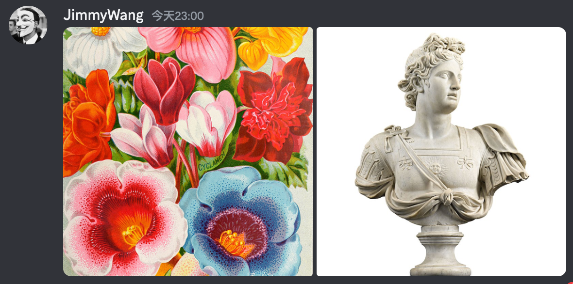 先说下这个 Image URL 是干什么用的,有很多玩法,比如将两张图合并为一张,大家可以看看下面这个例子,我就是将一个大理石雕像和花朵的图片上传到 Discord: