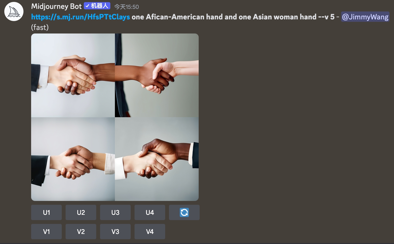 将你看到的不错的 stock photo 发给 Midjourney Bot(我还是以前面的那张握手照为例)