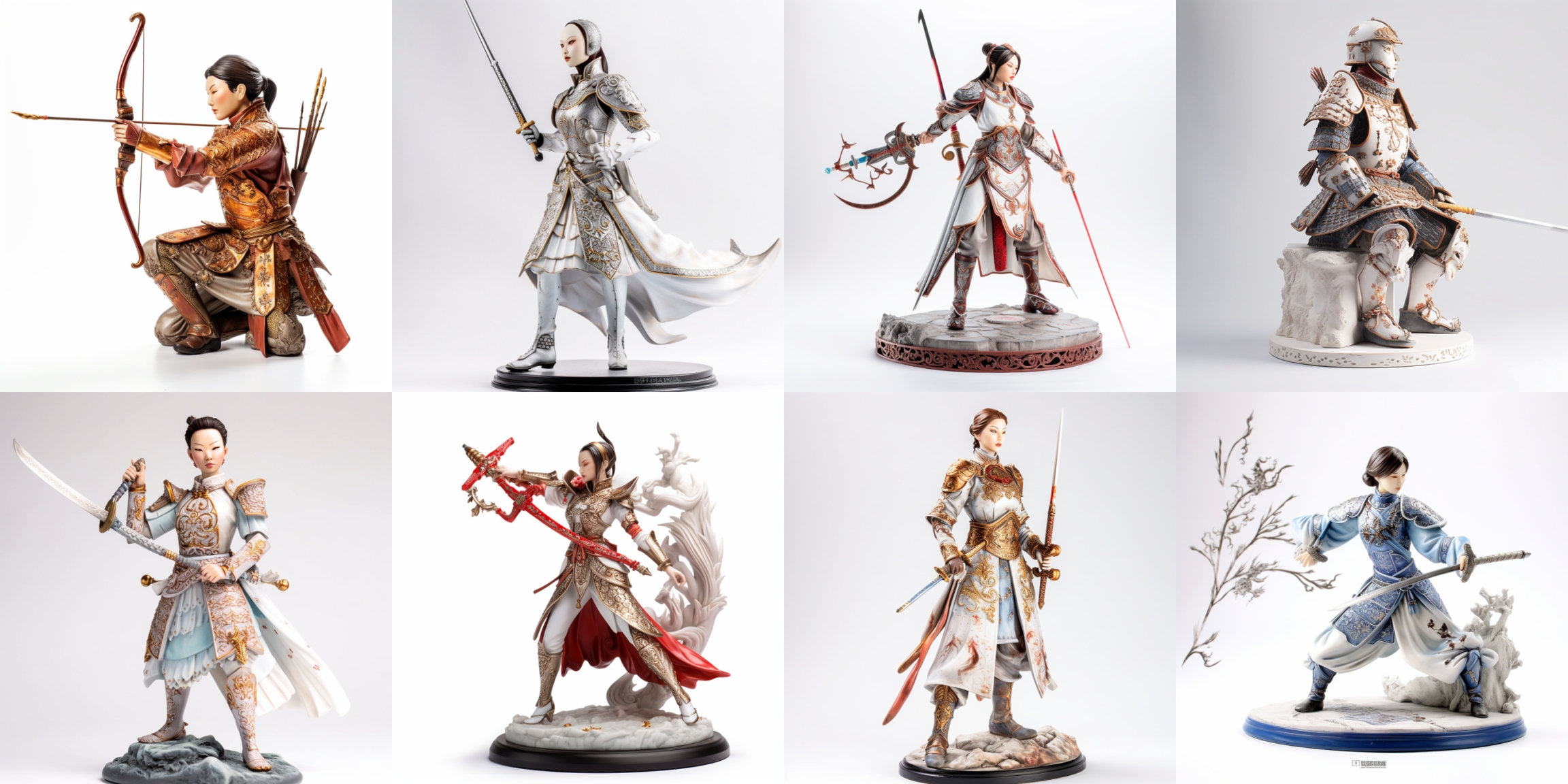 各位有没有发现,上面那个 Chinese 手办生成的结果好像只有第三张是中国人面孔?原因是 Chinese style 的权重太低,所以仅输出了一个结果。你在实践的过程中,也肯定会遇到,AI 忽略了某些 prompt 词的情况,比如你提到画面中要有一只鸟,但它就是没画出来。