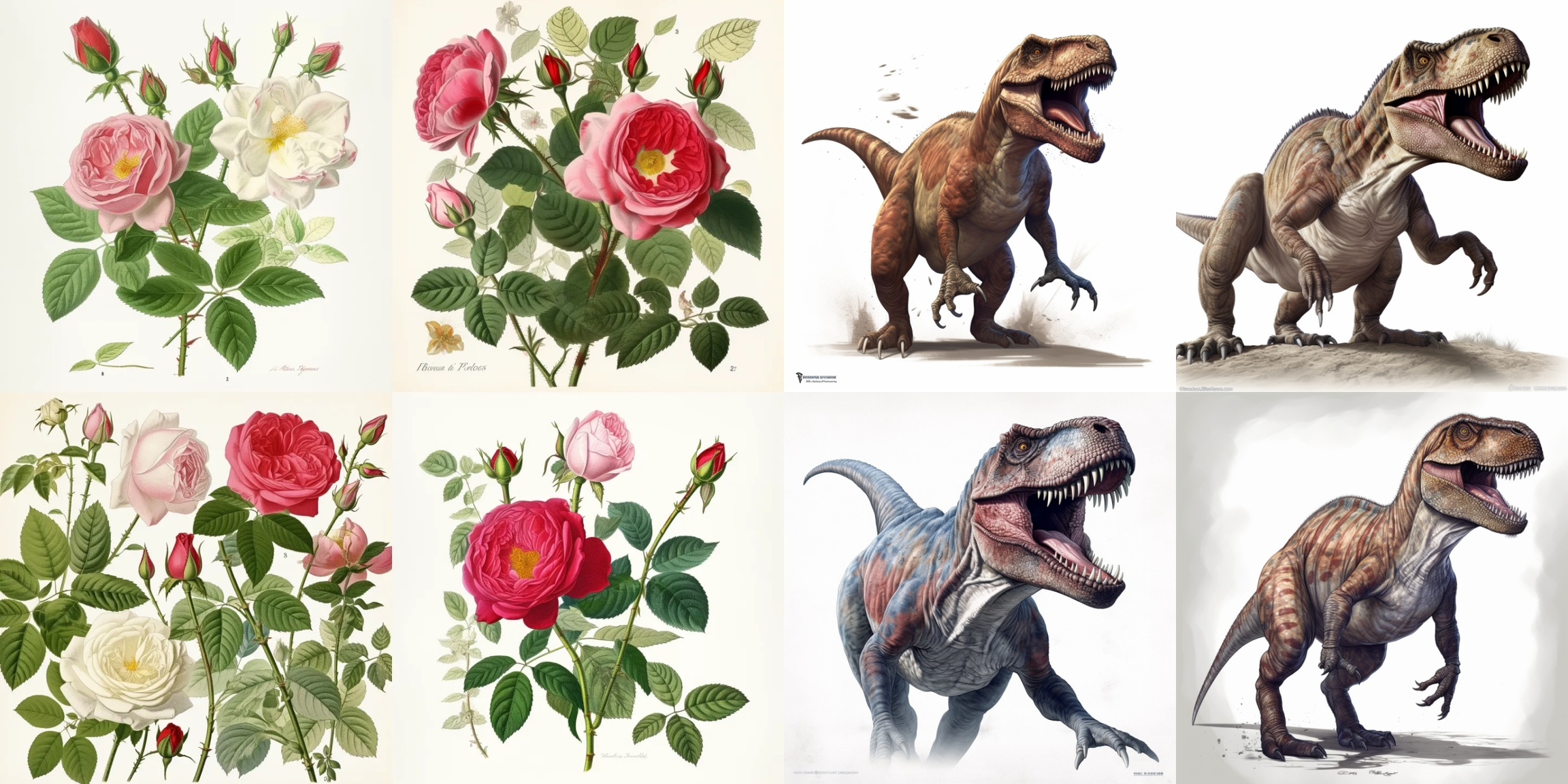 以下是生成的图片,看起来,Midjourney 并不知道霸王龙只有两只脚,哈哈哈,不过第一张真的非常像 Andrey 的风格:
