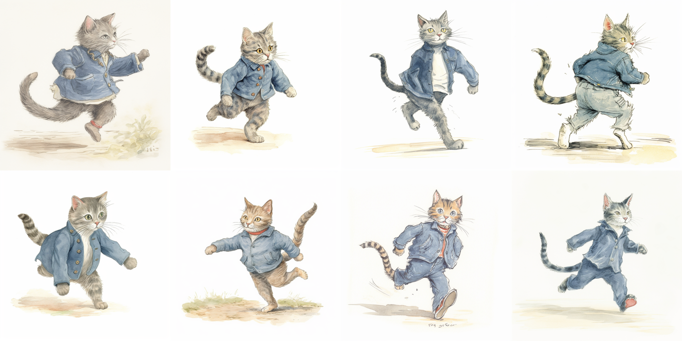 另外我们也试试小熊维尼的插画师 E.H. Shepard 的风格(右边四张)。这里要额外说明下,为了让生成的结果更倾向于该作者的风格,我没在 prompt 里加入太多背景信息:
