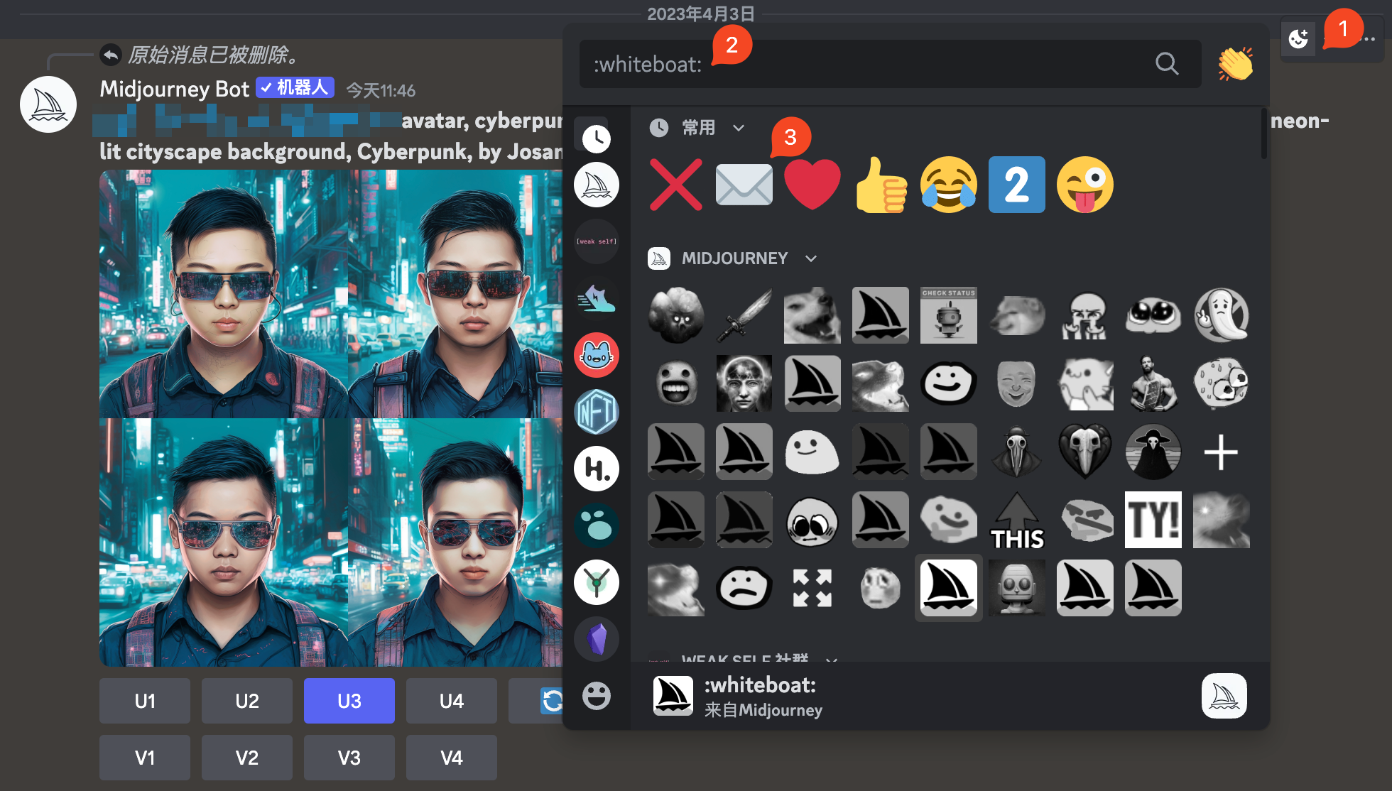 基于某一次生成的结果进行二次 prompt 修改,理论上我认为是可以的,以赛博朋克头像为例,我先用上述 prompt 生成了四张图片,然后在消息的右上角点击 emoji 按钮(下图1),然后再输入框里(下图2)输入 envelope,然后点击信封 emoji(下图3),接着 bot 就会将 seed 号码发给你。